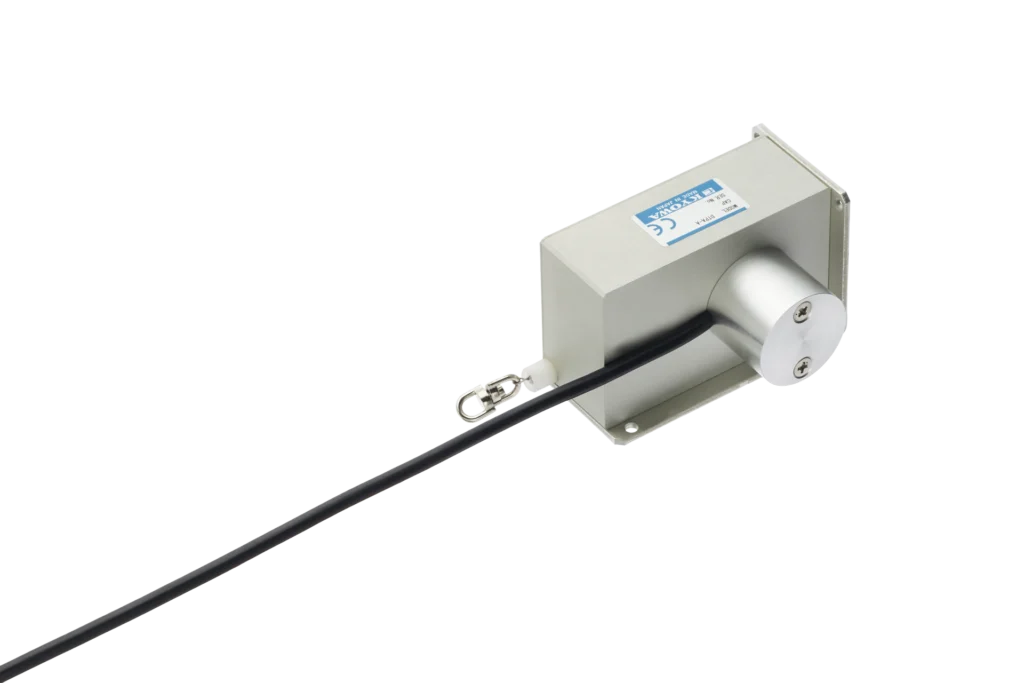 포텐셔미터를 통해 변위 검출용 와이어의 신축을 전기량으로 변환하여 변위량을 측정하는 변환기입니다. 꺾임·꼬임(킨크)이 발생하기 어려운 와이어를 사용하고, 측정 범위 내에서 인출·권취 중 측정력이 변하지 않아 안정적인 측정이 가능합니다.