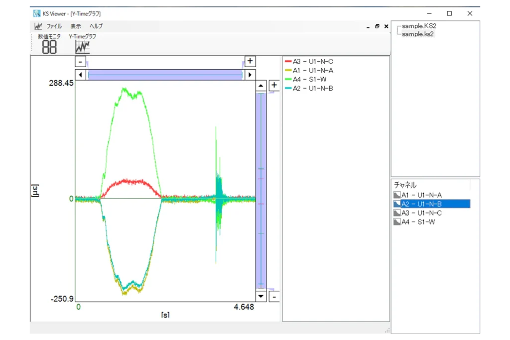 당사 측정기로 집록한 복수의 KS2 파일을 재생할 수 있습니다. KSViewer는 무상으로 제공되는 KS2 파일 재생 소프트웨어입니다. KS2 파일 형식으로 데이터 집록을 수행하는 다이내믹 계측 분야에 사용할 수 있습니다. ※ KS2: 교와전업(共和電業)의 표준 파일 포맷 형식