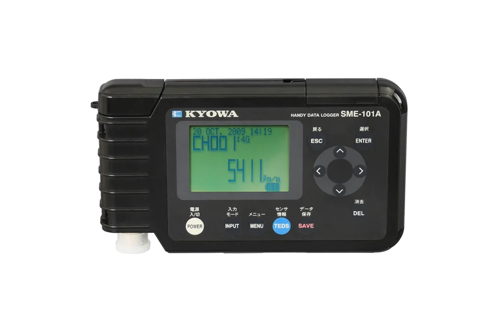 스트랩이 부속되어 있어 현장에서의 점검이나 센서 설치 시 확인 작업에 적합한 핸디형 측정기입니다. 또한 부속 입력 케이블을 사용하면 스트레인 게이지도 간편하게 연결할 수 있습니다. SME-100A/101A는 네트워크 터미널 박스 NTB-100/200 시리즈와 연결 시 최대 33채널의 계측에 대응합니다.