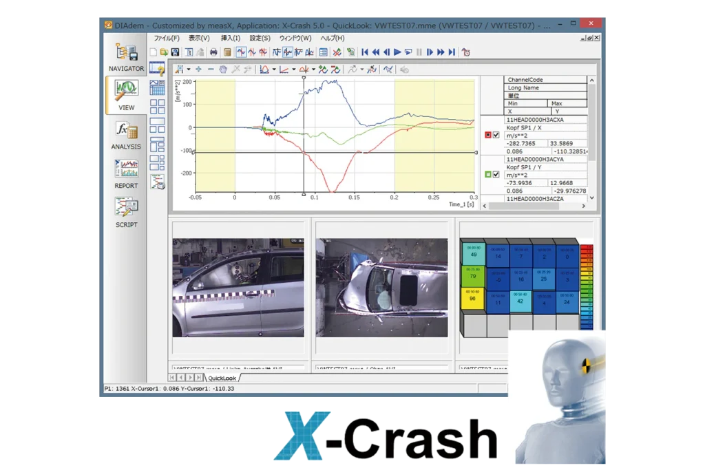 차량 안전성 평가 시험을 위한 소프트웨어 시스템입니다. measX사(본사 소재지: 독일)가 수십 년에 걸쳐 축적해 온 계측 데이터 해석과 차량 안전성 분야의 전문 지식·경험을 바탕으로 하고 있습니다.